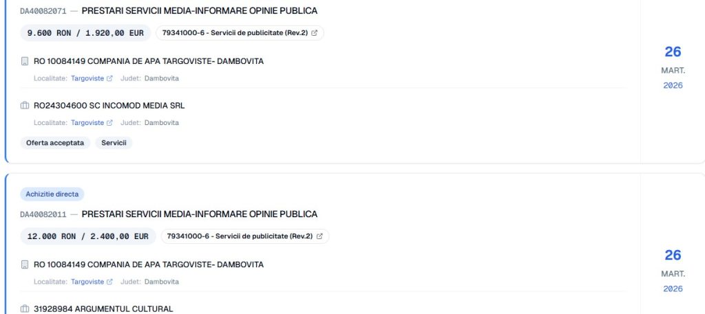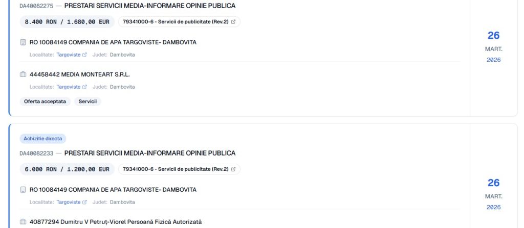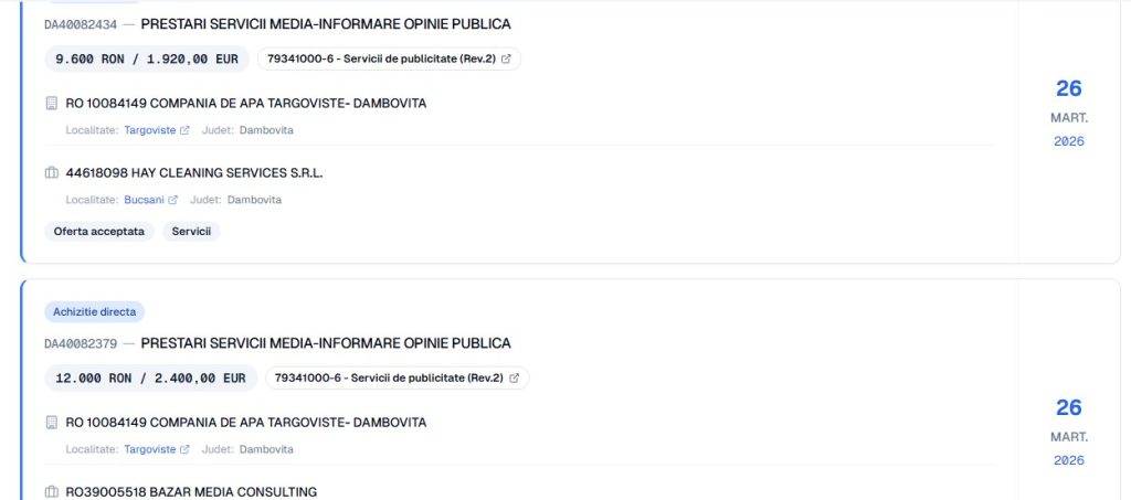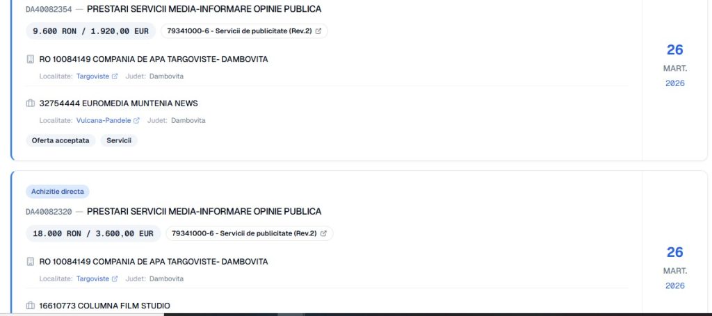 Iată numele părților și contractele (înregistrate în SEAP) tuturor celorlalte “entități media” ce au fost cadorisite, generos, de CATD, în 2026 (n.m– am identificat 19 astfel de contracte, în total). Încă o dată, este vorba, până la urmă, de banii dâmbovițenilor, ce sunt obligați, în 2026, să plătească cele mai mari tarife din țară, pentru serviciile de apă și canalizare: