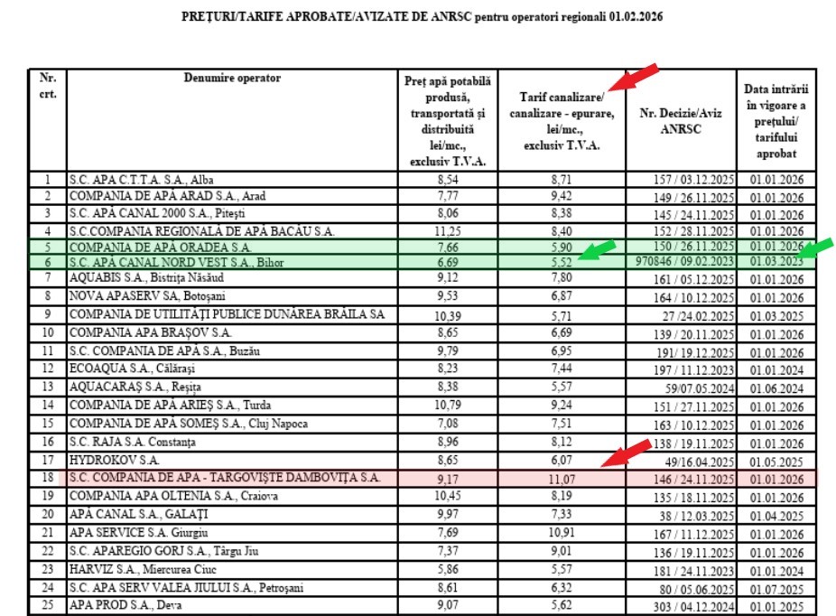 Foto: Tarife pentru servicii de apă și canalizare, în România, în februarie 2026, așa cum sunt înregistrate la ANRSC
