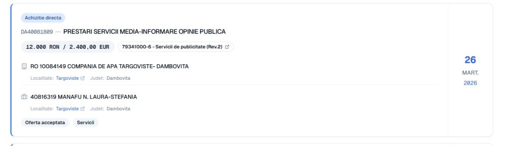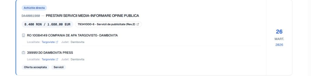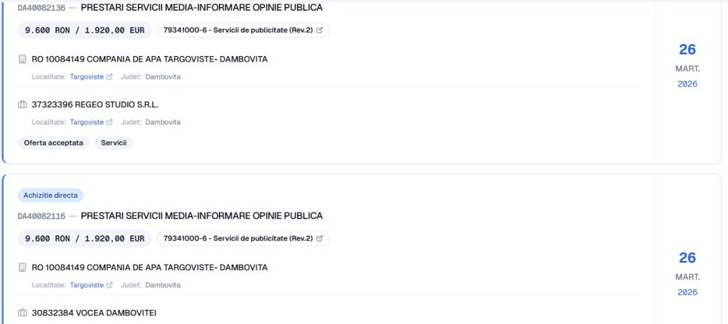 Foto” Contracte publicitate media, servicii de informare publică , înregistrate în SEAP, în martie 2026, între CATD și entități media din Dâmbovița.