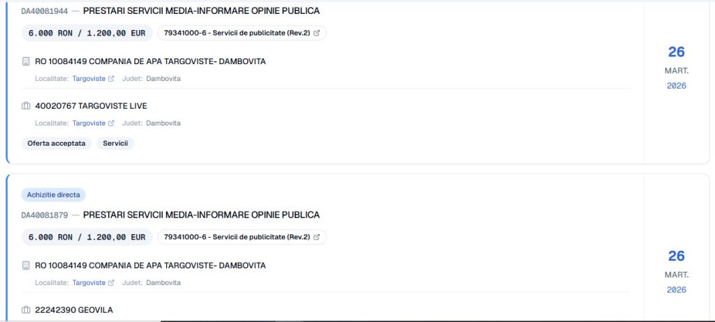 În perioada 26-27 martie 2026, pentru un număr de 19 entități media (sau pseudo media), au fost oferite, din nou, contracte generoase. Din banii dâmbovițenilor, evident. Încă o dată, pentru mai nimic. Publicitate media (servicii informare opinia publică), se spune. Inclusiv o firmă deținută de o persoană ce are același nume și prenume cu cel al unui fost director al CATD se află în lista de firme cadorisite, de CATD, cu contracte generoase de publicitate media (n.m.- este vorba de firma PROVOX Consulting, iar deținătorul acesteia se numește Alexandru Oprea, conform datelor de înregistrare de la Registrul Comerțului. Adică un nume identic cu cel al unui fost director general al CATD, ulterior președinte al CJ Dâmbovița, în ambele ipostaze ajuns din postura de membru al PSD Dâmbovița).