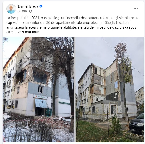 “La începutul lui 2021, o explozie și un incendiu devastator au dat pur și simplu peste cap viețile oamenilor din 30 de apartamente ale unui bloc din Găești. Locatarii anunțaseră la acea vreme organelle abilitate, alertați de mirosul de gaz. Li s-a spus că e totul în regulă. A doua zi, explozia s-a produs.