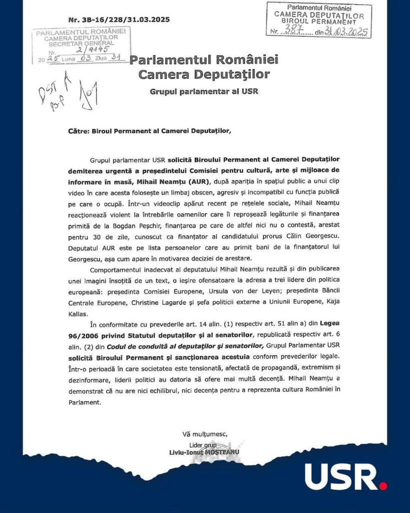 Neamțu, ce ocupă postul de președinte al Comisiei de Cultură din Parlament, ca reprezentant al celor de la AUR, a avut un comporament inacceptabil, în totală opoziție cu ceea ce ar impune demnitatea funcției pe care o ocupă, în Parlament, spune deputatul dâmbovițean Daniel Blaga (USR).