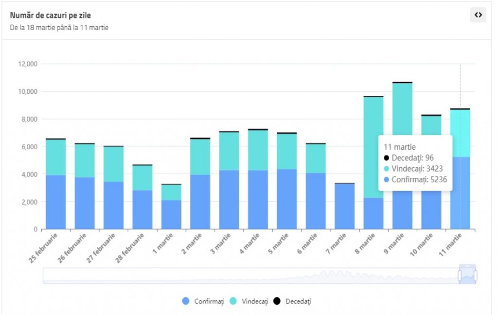 Tot în ultimele 24 de ore au fost raportate alte 108 decese (inclusiv în județul Dâmbovița, unde numărul total de cazuri de deces, de la debutul pandemiei, era de 618, în data de 11 martie). La ATI, în momentul de față, sunt internați 1166 de pacienți.
