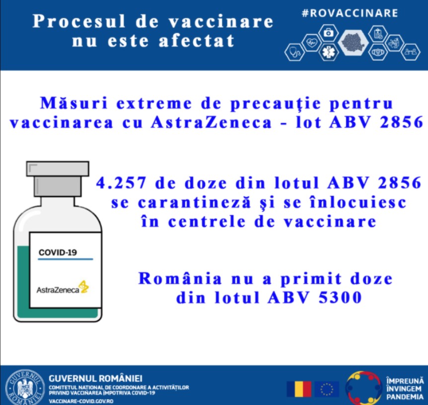 În ceea ce privește lotul ABV 2856 pentru care Italia a decis suspendarea temporară a vaccinării cu vaccinul din lotul menționat, precizăm că România a recepționat prima tranșă de vaccin AZ de 81.600 doze în data de 07.02. ac. Începând cu data de 15.02 a.c., au fost utilizate 77.049 de doze, fiind distribuite în următoarele județe: Arad, Bacău, Bihor, Bistrița-Năsăud, Botoșani, Caraș Severin, Cluj, Dolj, Galați, Gorj, Hunedoara, Iași, Maramureș, Mehedinți, Neamț, Olt, Sălaj, Satu Mare, Suceava, Timiș, Vâlcea și Vaslui. Celelalte 4.257 se regăsesc în Centrele de vaccinare din județele Bacău, Bihor, Botoșani, Dolj, Gorj, Iași, Neamț, Suceava, Timiș, Vâlcea, Vaslui și 60 de doze la Centrul Regional de Depozitare Craiova.