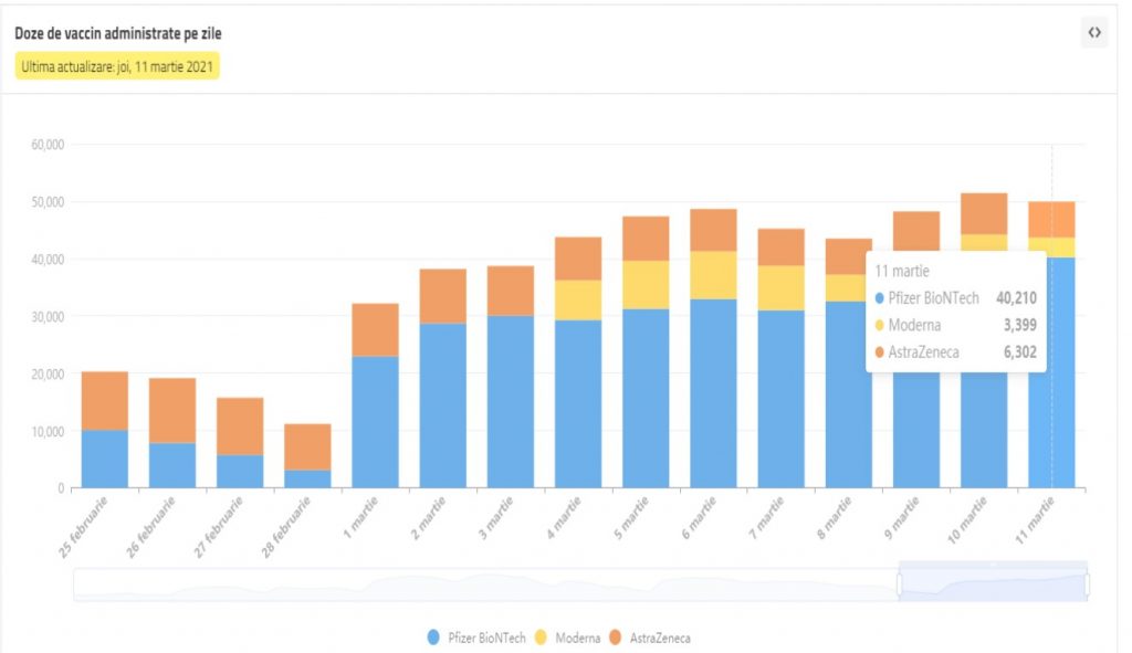 În România s-a ajuns la un total de 2.019.757 de doze de vaccin administrate, practic doar 683.289 de români fiind imunizați complet (2 doze de vaccin). Este vorba de vaccinarea cu vaccinurile produse de AstraZeneca, Pfizer sau Moderna, până în data de 11 martie ( procentual 2,51% din populație).