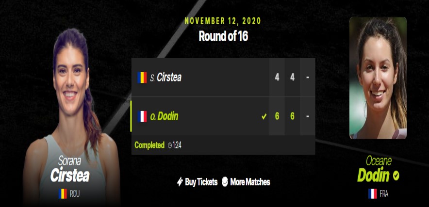 Sorana a cedat în două seturi simetrice (4/6,4/6) în față lui Dodin, o jucătoare mai slab clasată decât românca, după ce, în fiecare set, adversara sa a reușit un break mai mult (unul în primul set si două în cel de-al doilea).