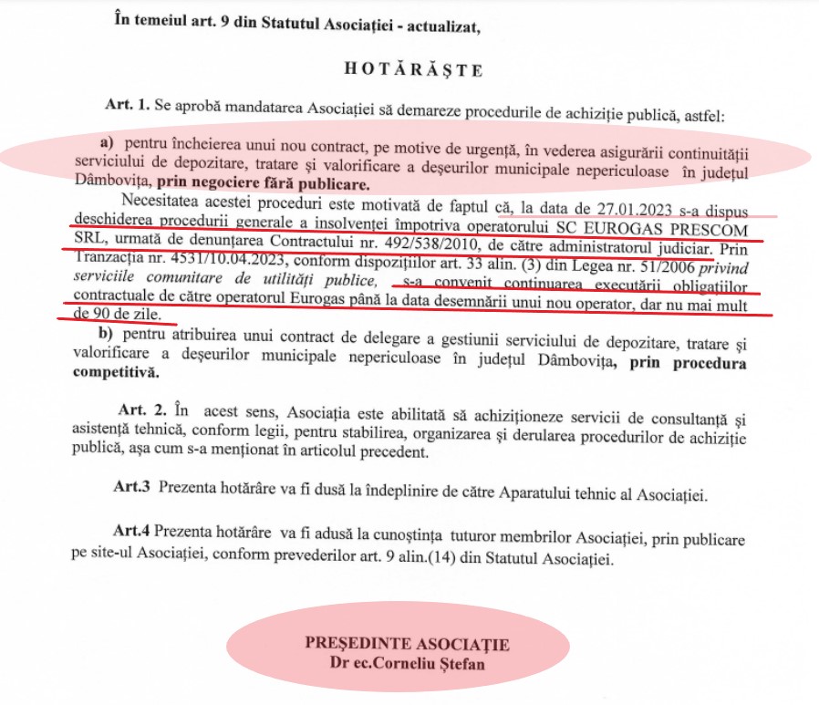 Ulterior, din februarie 2022, s-a spus că s-a rezolvat problema colectării separate a deșeurilor (detalii aici- Valahia Media). S-a spus, doar. Realitatea fiind aceea că, practic, CJ Dâmbovița, Primariile și ADI Managementul Integrat al Deșeurilor ( noua denumire a ADI Salubritate) ar trebui să amendeze cetățenii ce nu colectează separat deșeurile, Dar, acest lucru înseamnă voturi în minus. Foarte multe voturi în minus. Astfel că nu s-a întâmplat și, cel mai probabil, nu se va întâmpla niciodată. În plus, nici angajamentele luate de ADI Managementul Integrat al Deșeurilor Dâmbovița și Supercom nu sunt respectate întocmai ( la capitolul preluare/colectare separată a deșeurilor, presupus depozitate astfel). Așa că s-a ales varianta rezilierii contractului cu cei de la Eurogas Prescom ( “prea sacandalagii”, în viziunea CJ Dâmbovița și ADI Managementul Deșeurilor), cu speranța că noi concesionari ai gropilor de gunoi din Dâmbovița, care or să fie aceștia, să facă “treabă mai bună”. nU se înghesuie nimeni, din câte se pare. Totuși, începând cu data de 8-10 iulie ( vezi un document , mai jos, în care se anunță că Eurogas Prescom mai operează, în Dâmbovița, doar 90 de zile maxim, începând cu data de 10 aprilie 2023) ar trebui ca Eurogas Prescom să nu mai aibă în gestiune cele două depozite de gunoi din Dâmbovița.