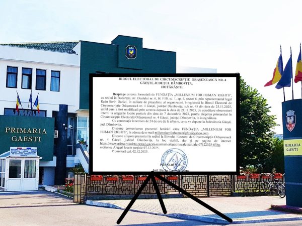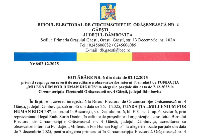 Cu un vot de 7-3 s-a decis interzicerea trimiterii de observatori, la alegerile de la Găești, din partea ONG-ului Fundația Millenium for Human Righs.