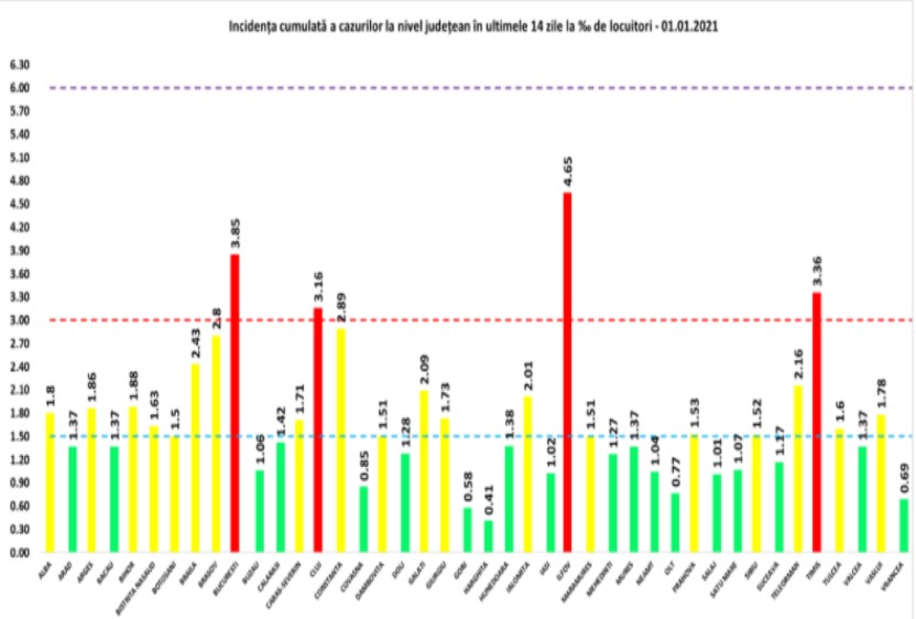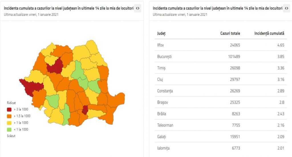 În prima zi din 2021 autoritățile au anunțat că au fost înregistrate alte 3983 de cazuri noi de îmbolnăvire cu noul coronavirus. Dintre cazurile noi, 40 sunt în județul Dâmbovița, unde rata de incidență continuă să scadă și a ajuns acum la o valoare de 1,51 (aproape de intrare în scenariul verde, de sub 1,5 la mie). Tot în ultimele 24 de ore au fost raportate alte 74 de decese (inclusiv în județul Dâmbovița). La ATI numărul pacienților a scăzut, acum fiind în secțiile de terapie intensivă (covid)-1111 pacienți.