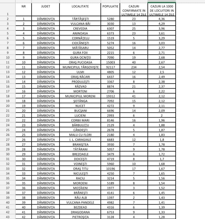 Județul Dâmbovița a încheiat anul 2020 cu doar 6 localități în scenariul rosu (incidență de peste 3 la mie), respectiv Tărtășești, Vulcana-Băi, Crevedia, Aninoasa,Cornățelu si Ciocănești, dar cu o situație destul de complicată, în continuare, la nivel de unități medicale (dedicate covid). Sute de dâmbovițeni (aproximativ 200) sunt în continuare internați cu simptome severe ale bolii. Și decesele (din rândul bolnavilor) au fost o constantă cotidiană, în spitalele din Dâmbovița, în decembrie 2020.