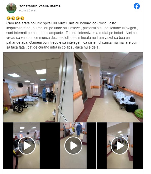 “Cam așa arată holurile spitalului Matei Bals cu bolnavi de Covid, este înspăimântător, nu mai au pe unde să îi așeze, pacienții stau pe scaune la oxigen, sunt internați pe paturi de campanie. Terapia intensivă s-a mutat pe holuri. Nici nu vreau să vă spun ce muncă duc medicii, de dimineață nu i-am văzut să bea un pahar de apă. Oameni buni, trebuie să înțelegem că sistemul sanitar nu mai are cum să facă față, cât de curând intră în colaps, dacă nu e deja”.