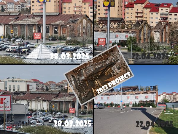 Dacă acestea erau imaginile din 28 martie 2025, iată că o lună mai târziu, adică la momentul 22 aprilie 2025, locul a fost acoperit parțial, iar din structura clădirilor au dispărut părți importante, practic, iar în picioare mai sunt doar niște ziduri, ce nu mai susțin mare lucru. La acest moment, nu este clar dacă s-a demarat și o construcție sau este vorba doar de o demolare parțială, în zonă nefiind nicio activitate susținută, iar de panouri de publicitate a construcției (obligatorii) nici nu poate fi vorba (n.m.– cel puțin acestea nu au putut fi identificate de autorul acestui material).