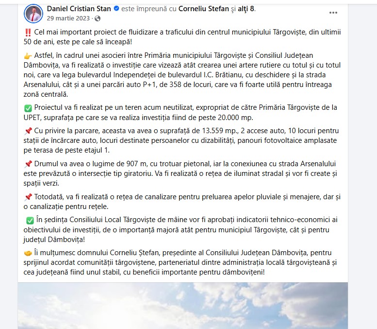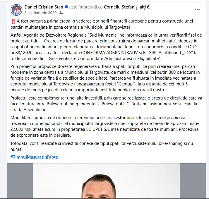 Foto: Anunț (facebook) primar Târgoviște, despre demararea procedurilor pentru construirea unei parcări supraetajate în zonă (septembrie 2020), captură pagina facebook ; Sursa foto: Daniel Cristian Stan /facebook