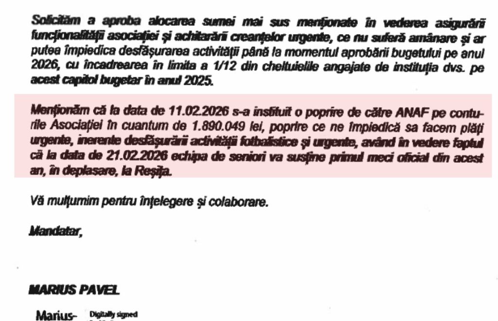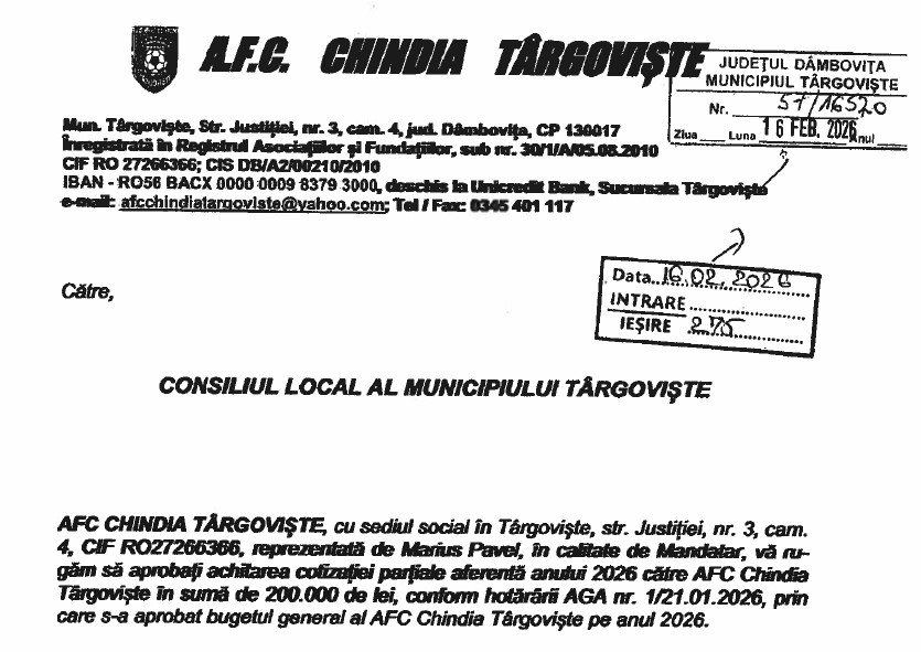 Într-o scrisoare oficială, a celor de la Chindia, adresată Primăriei Târgoviște, în care , administrației publice locale, i se solicită să acorde de urgență o parte din cotizația anului 2026 (n.m.- Primăria Târgoviște este parte din Asciația FC Chindia, iar cotizația anuală este stabilită la o valoare de 2,4 milioane de lei), respectiv suma de 200.000 de lei, cei de la Chindia recunosc că au conturile blocate, din 11 februarie 2026. De asemenea, în scrisoarea semnată de președintele clubului, Marius Pavel, se specifică clar că situatia este disperată, financiar, fiind practivc nevoie de bani publici ( din nou!!!) pentru a se acoperi o parte dintre datoriile acumulate.
