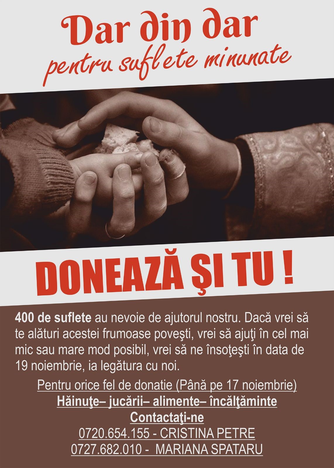 O inițiativă născută în lumea virtuală, pe o pagină de facebook (detalii aici), poate căpăta dimensiunea unui gest semnificativ, care poate să schimbe ceva în lumea reală. 400 de copii, între trei și 19 ani, din comuna Glodeni (județul Dâmbovița) pot primi mai mult decât un mic ajutor, prin intermediul celor ce au inițiat proiectul „Dar din dar pentru suflete minunate”. Prin intermediul proiectului, inițiatorii și-au propus să strângă haine, jucării și alimente (neperisabile, pentru cantina Parohiei Glodeni Deal ce oferă, duminică de duminică, o masă pentru copiii amintiți anterior, copii cu posibilități materiale reduse).