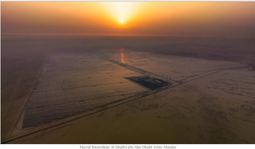 Foto: Cel mai mare parc fotovoltaic din lume (Emiratele Arabe Unite); Putere instalată de 2GW ( suprafață de 20 km pătrați)
