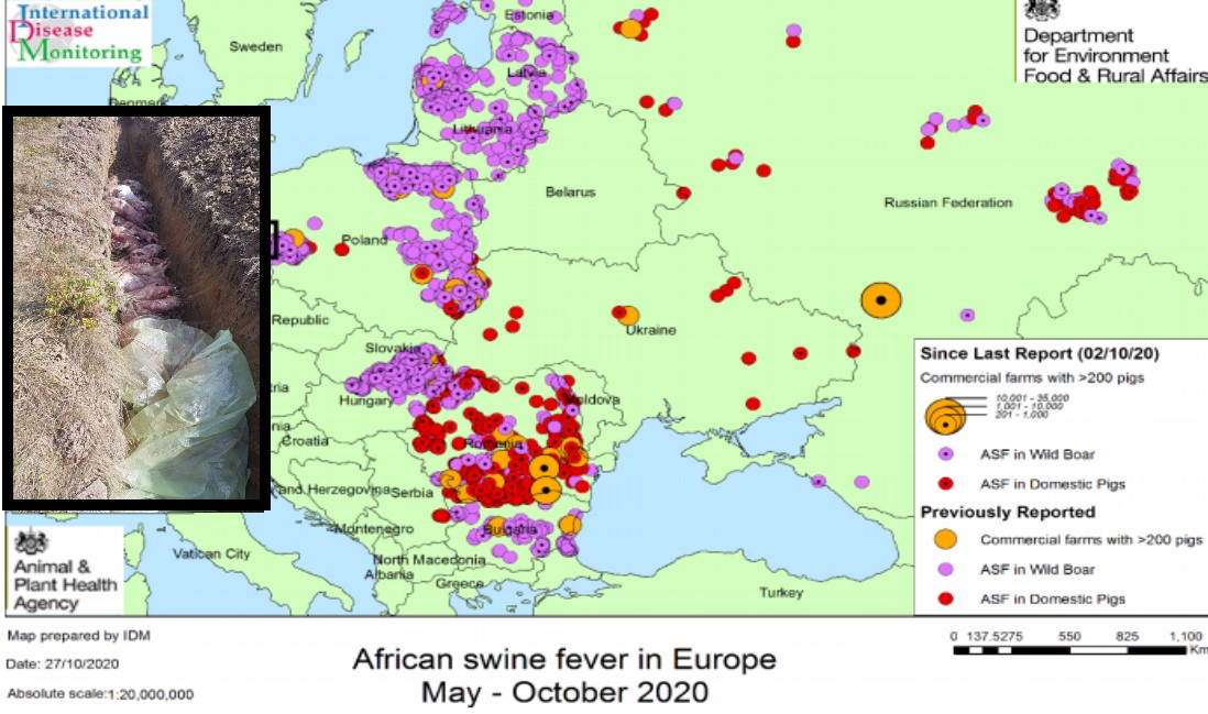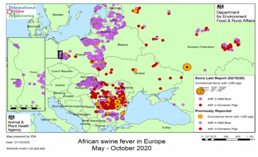 Conform unui raport (27 octombrie 2020) al Department for Environment, Food and Rural Affairs Animal and Plant Health Agency Advice Services – International Disease Monitoring (UK):