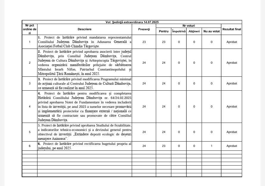 Foto: Situație voturi în cadrul sedinței de urgență de la CJ Dâmbovița (14.07.2025). La punctul 1 de pe ordinea de zi, cel privitor la Chindia, au fost 23 de voturi “pentru”, din tot atâția consilieri prezenți.