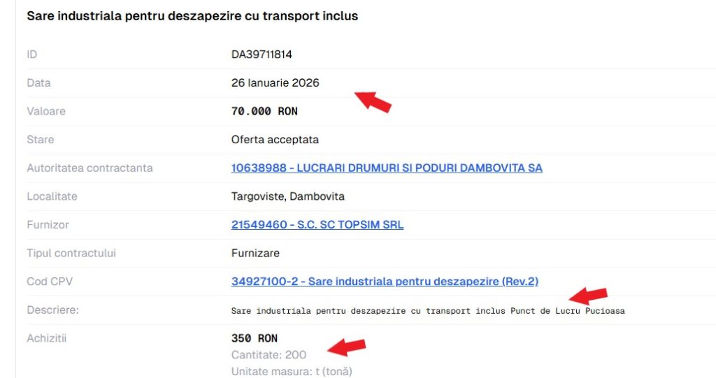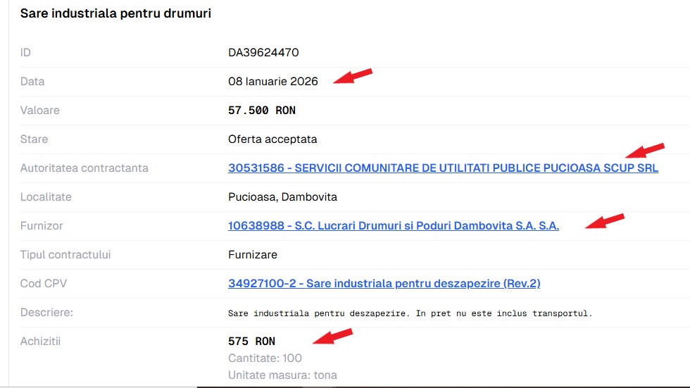 În data de 8 ianuarie 2026, adică când deja iarna era instalată temeinic și în Dâmbovița, primăria orașului dâmbovițean Pucioasa semnează un contract cu SC LDP Dâmbovița (SC Lucrări Drumuri și Poduri Dâmbovița), o societate în subordinea CJ Dâmbovița. Prin contract, SC LDP se obligă să furnizeze, către Primăria Pucioasa, cantitatea de 100 de tone de sare industrială, pentru deszăpezire, la prețul de 575 de lei tonă (transport neasigurat).