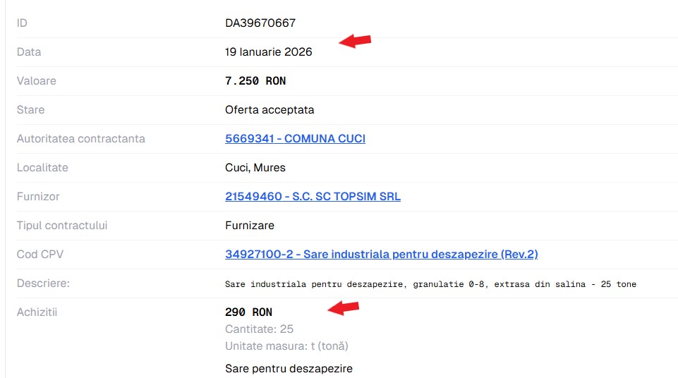 Mai mult chiar, firma, SC Topsim SRL, care a vândut sare către SC LDP Dâmbovița, la prețul de 350 lei/ tonă, pentru ca SC LDP să vândă același produs, către Primăria Pucioasa, la prețul de 575 lei / tonă, vinde (în data de 19 ianuarie 2026), aceiași sare industrială pe care o produce, către comuna mureșeană Cuci, cu prețul, iar atenție!!!, de 290 de lei/ tonă, adică de două ori mai ieftin decât prețul cu care achiziționează produsul Primăria Pucioasa, din Dâmbovița.