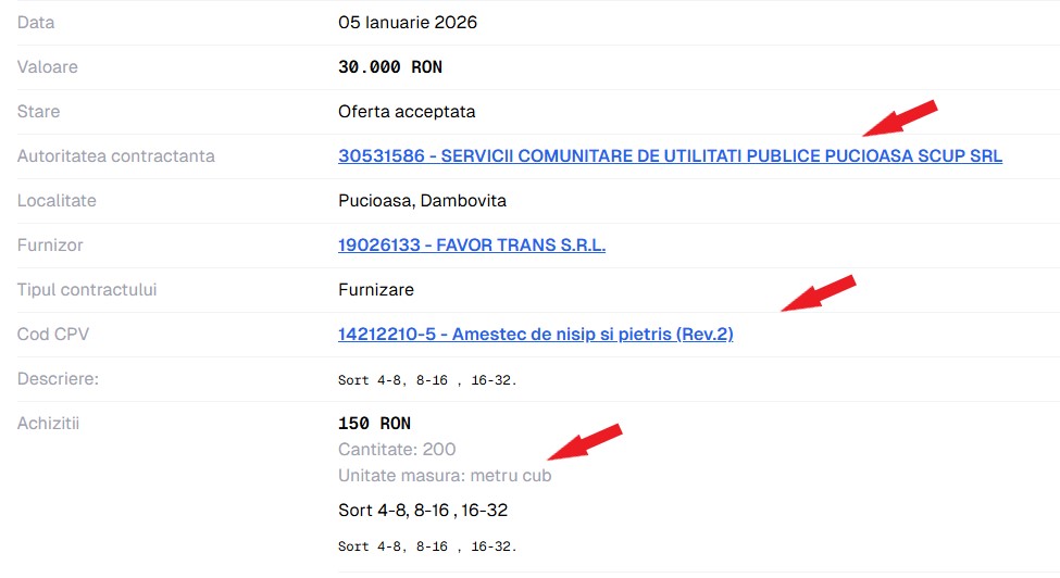 Aceleași două entități mai parafează o înțelegere, pentru 200 de metri cub de amestec de pietriș și nisip (6000 de euro), una, înțelegerea, în care SC LDP Dâmbovița este furnizor, iar Primăria Pucioasa (prin Servicii Comunitare de Utilități Publice Pucioasa SCUP SRL) este beneficiar al serviciului.