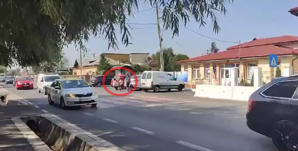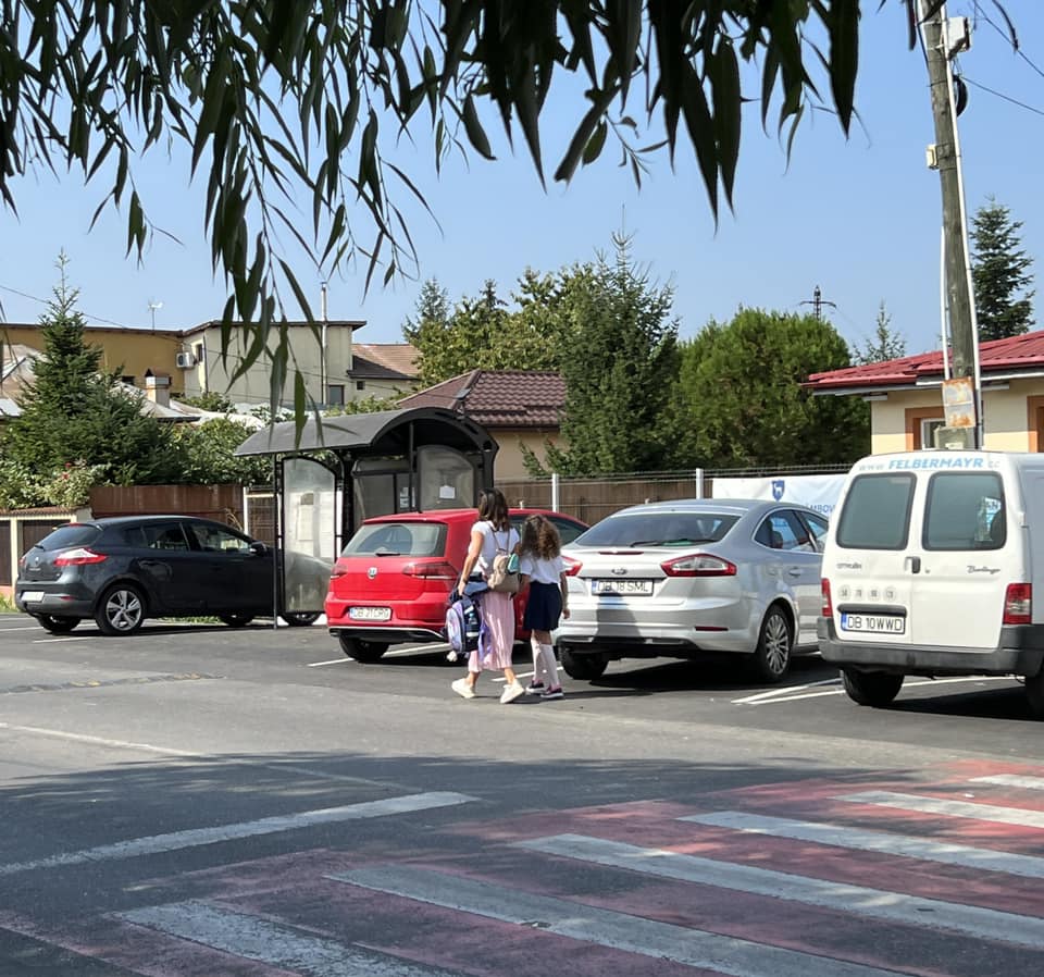 Foto: O parcare a ocupat trotuarul din fața unei unități de învățământ, din Răzvad. Totul a fost realizat în cadrul unui proiect PJDL, iar acum pietonii sunt nevoiți să circule pe carosabil. Inclusiv copiii ( sursa foto: Dragoș Popescu/ Facebook).