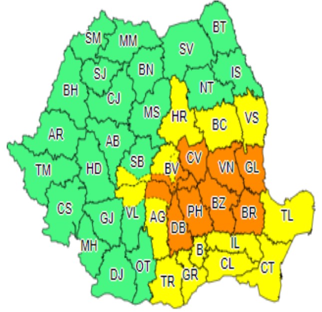 Zone afectate: județele Vrancea, Galați, Brăila, Buzău, Prahova, Dâmbovița, Covasna și în zona de munte a județelor Argeș și Brașov;