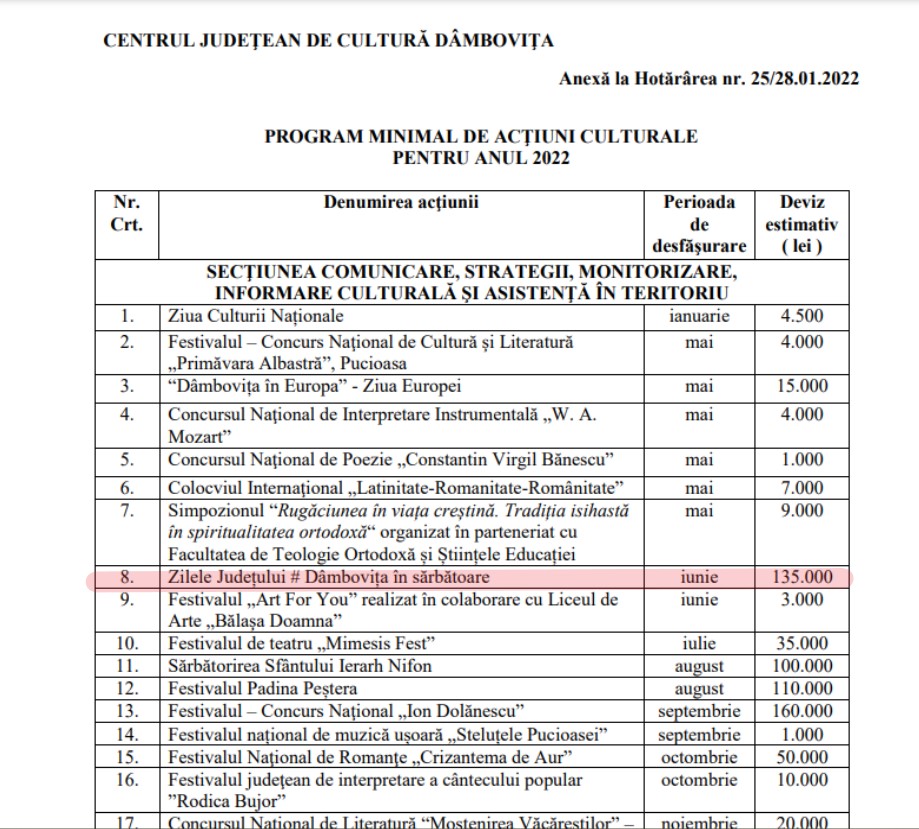 Foto: Alocare inițială pentru evenimentul “Zilele Județului Dâmbovița” în anul 2022 (suma de 135.000 de lei)