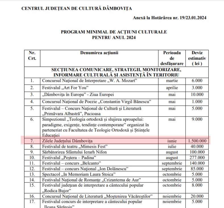 Suma de 1,5 milioane de lei, alocată pentru evenimentul intitulat “Zilele Județului Dâmbovița”, este mai mult de jumătate din totalul sumei alocate, în 2024, Centrului Județean de Cultură Dâmbovița, pentru organizare acțiuni culurale (n.m.- aproximativ 2,68 de milioane de lei este tot bugetul; click mai jos, pe download, pentru detalii)