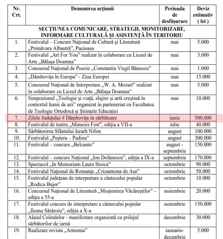 Foto: Alocare inițială pentru evenimentul “Zilele Județului Dâmbovița” în anul 2023 (suma de 500.000 de lei)