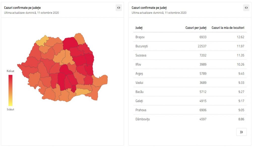 La momentul actual (11 octombrie), zona de nord a Munteniei și cea mai mare parte din Moldova par a fi principalele focare ale noului coronavirus din România. Cu un număr de 6933 de cazuri Brașovul ( incidență totală de 12,62) este pe primul lo,a la nivel natțonal. Situația cea mai complicată este însă la București (incidentă a cazurilor de 2,53 în ultimele 14 zile si de 11,97 de la debutul pandemiei.) Județul Dâmbovița se afla poziționat pe locul 10, la nivel național (incidentă totală de 8,86, de la debutul pandemiei).