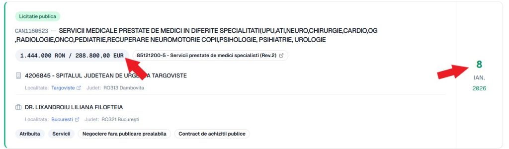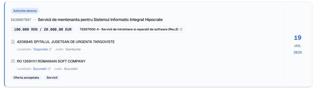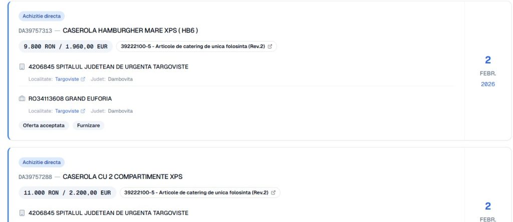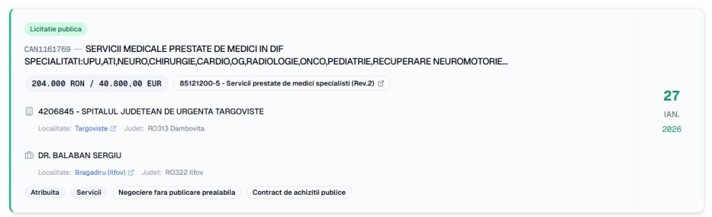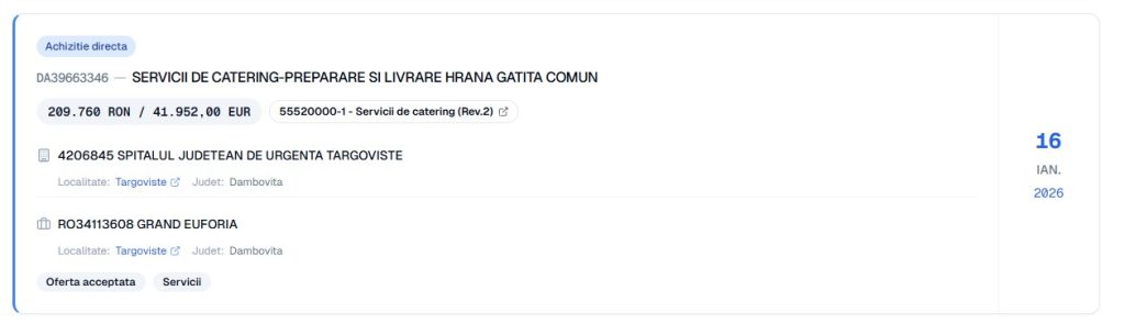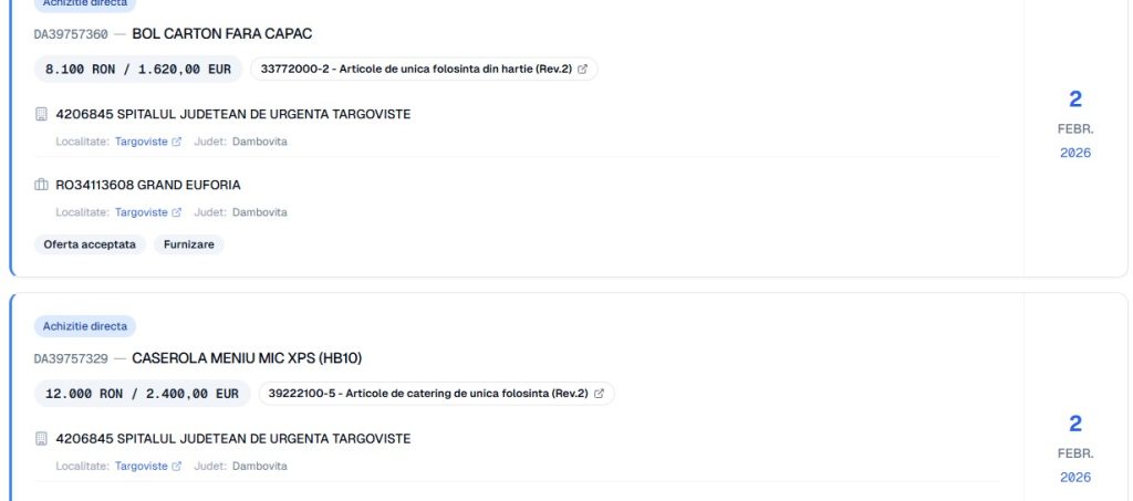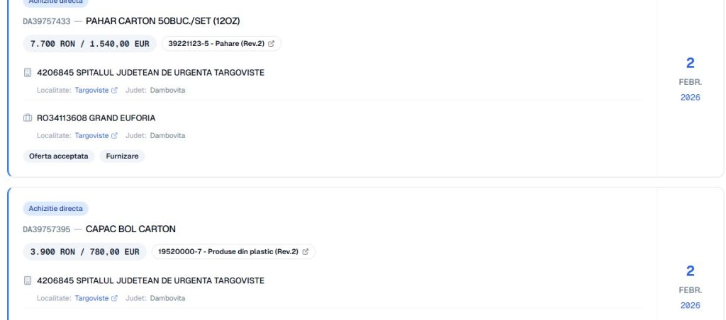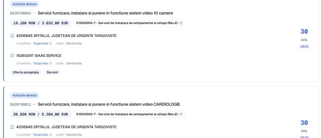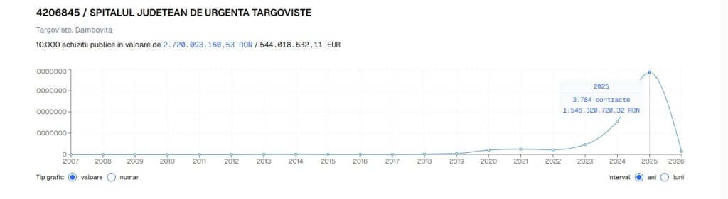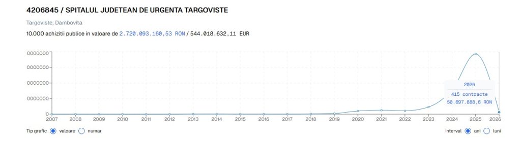 În cazul în care mai era cineva care nu știe, Spitalul Județean de Urgență din Târgoviște (SJUT) este cea mai mare “afacere” cu fonduri publice din Dâmbovița, în sensul în care nivelul de cheltuieli de aici (n.m.– fondurile publice, după cum spuneam) depășește, cu mult, orice are la dispoziție orice UAT, fie că vorbim de CJ Dâmbovița, de primăria celui mai mare oraș din Dâmbovița (Târgoviștea) sau orice altă structură alimentată din banii statului. SJUT are înregistrate, doar în SEAP (sistemul electronic de achiziții publice), în 2025, un număr de 3784 de contracte (servicii și bunuri achiziționate) în valoare de peste 1,54 miliarde de lei (peste 300 de milioane de euro). Costă mult, foarte mult, actul medical de calitate, se spune!