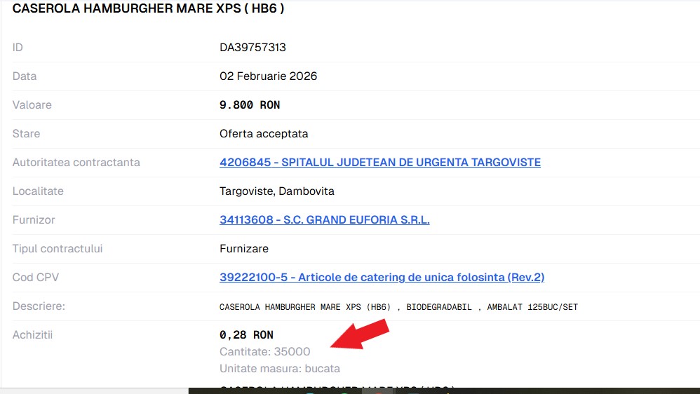 SJUT este la fel de generos și în achizițiile de consumabile. Zeci de mii de euro au fost plătiți, spre exemplu, pentru achiziția de caserole de plastic, pentru mâncare (zeci de mii de bucăți). Firma ce le furnizează asigură și serviicii de livrare mâncare în regim de catering către SJUT (probabil către personal, pentru că pacienții au la dispoziție bucatăria spitalului). Alte zeci de mii de euro anual. Prin achiziții directe. Evident aș spune. Firma? O celebră firma locală, bine ancorată în contractele cu sistemul public (și despre acest subiect și cu o altă ocazie).