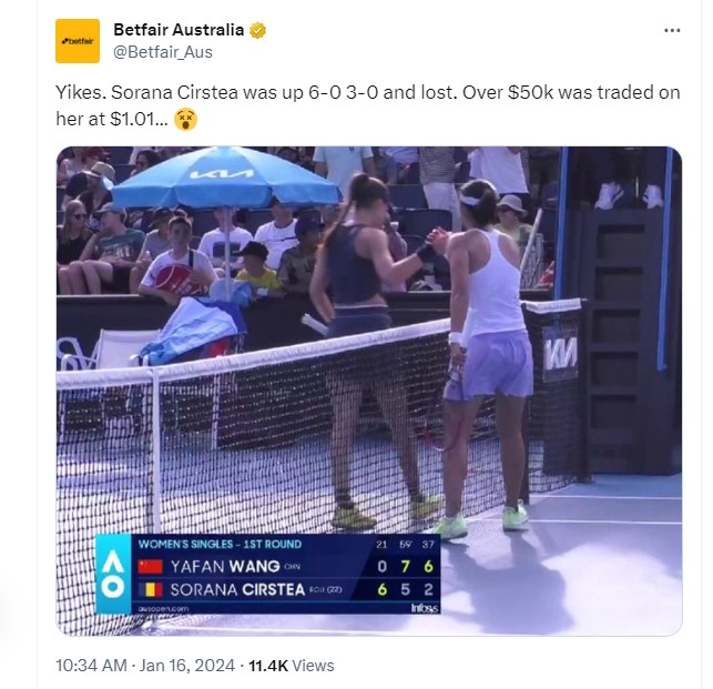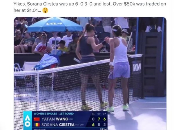 Conform contului de Twitter (X) al celor de la Betfair Australia, la scorul de 6-0, 3-0 pentru Sorana, pe jucătoarea româncă s- a pariat suma de 50.000 de dolari australieni, la o cotă de 1,01, pentru câștigarea partidei de către sportiva din Târgoviște, lucru aproape evident a se întâmpla, având în vedere evoluția scorului de până atunci. Pariorul nu ar fi câștigat decât 500 de dolari, la acea cotă, dacă Sorana câștiga partida, cum părea normal.