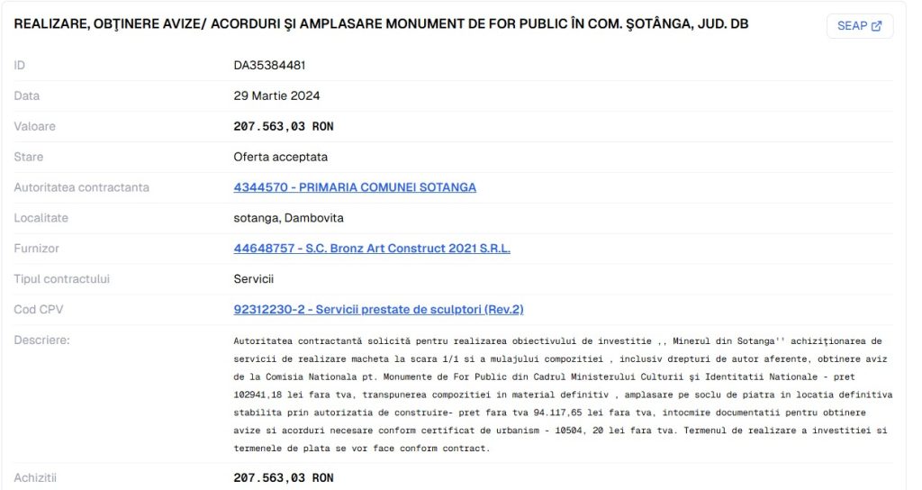 Dincolo de faptul că “evenimentul” a fost, mai mult, o sărbătoare de partid, în sensul la care la dezvelirea oficială, alături de conducerea localității (PSD) au stat doar colegii de partid ai primarului în funcție, am încercat a afla și cât a costat “monumentul”. Conform SEAP (sistem electronic de achiziții publice), în martie 2024, Primăria Șotânga plătea 207.563 de lei (aproximativ 41.000 de euro) pentru “macheta la scara 1/1 a statuii- preț 102.941 de lei și transpunerea compoziției în material definitiv, amplasare pe soclu de piatră- preț fară TVA de 94.117,65 de lei”.