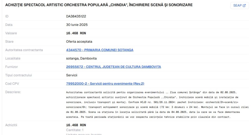 Tot în categoria cheltuielilor de amploare (cele pe care am reușit să le identificăm) se înscrie și închirierea, cu 3300 de euro, a ochestrei populare Chindia, ansamblu ce aparține CJ Dâmbovița. Adică bani de la UAT Șotânga, pentru UAT județul Dâmbovița.