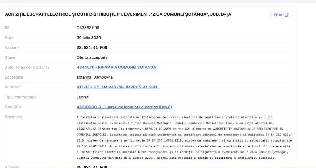 Peste 5600 de euro au fost plătiți pentru instalații electrice, achiziționate specific pentru evenimentul “Zilele comunei Șotânga 2025”