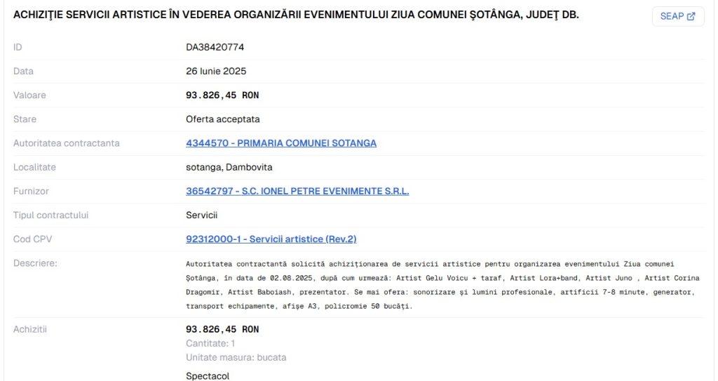 Cum la Șotânga, în județul Dâmbovița, intrarea în perioada de austeritate și reformă (n.m. – ce în România au început, practic, la 1 august 2025) a fost tratată cu o mare sărbătoare a comunității (n.m.- 1-2 august 2025, Zilele comunei Șotânga) am încercat a afla ce, și mai ales cât și cum, sărbătoresc șotângenii, la intrarea în perioada de “Austeritate și Reformă”. Așadar, datele următoare reprezintă doar o “trecere în revistă” a unor fonduri cheltuite de administrația comunei dâmbovițene Șotânga, cu ocazia “parangheliei” de 1-2 august 2025. Mult, puțin?