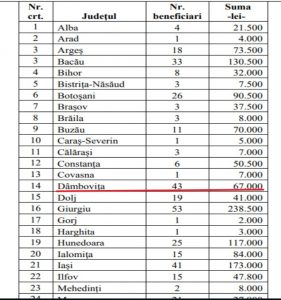 Am luat cazul unui județ unde ajutoarele amintite nu au fost acordate, nici pentru cei loviți de inundații,nici de incendii sau alunecări de teren. Dâmbovița are 43 de beneficiari, suma totală fiind de 67.000 de lei ( între 500 și 4000 de lei pentru fiecare beneficiar, în funcție de “problemă”).