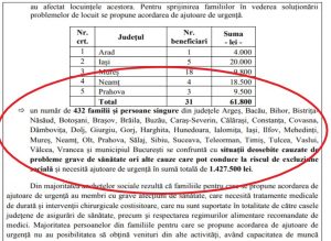 La o analiză atentă, excluzând cazurile clare, în care vorbim de familii afectate de incendii, inundații, alunecări de teren, din suma totală de 2,029 milioane lei rămân acordați (vezi foto document), pentru 432 familii și persoane singure, ce se confruntă cu situații deosebite cauzate de probleme grave de sănătate ori alte cauze care pot conduce la riscul de excluziune socială și necesită ajutoare de urgență, 1.427.500 lei.
