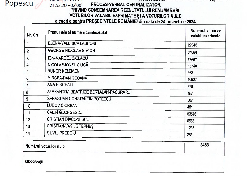 Document: Rezultate după renumărarea voturilor de la alegerile prezidențiale, din Dâmbovița