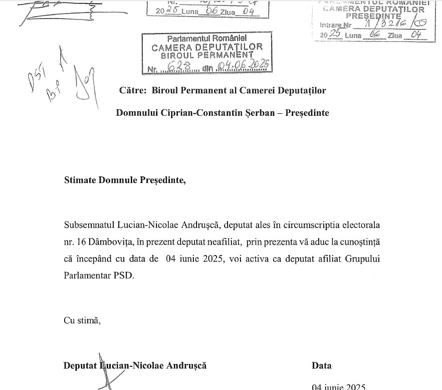 Ei bine, deputatul dâmbovițean Lucian Andrușcă a rămas neafiliat (independent), dar fidel cauzei “suveraniste” și deci anti-sistem, declarativ cel puțin, doar vreo două săptămâni. Asta pentru că, în data de 4 iunie 2025, deputatul Andrușcă a anunțat că trece în grupul PSD de la Parlament (vezi foto, document / declarație Lucian Andrușcă, mai jos):
