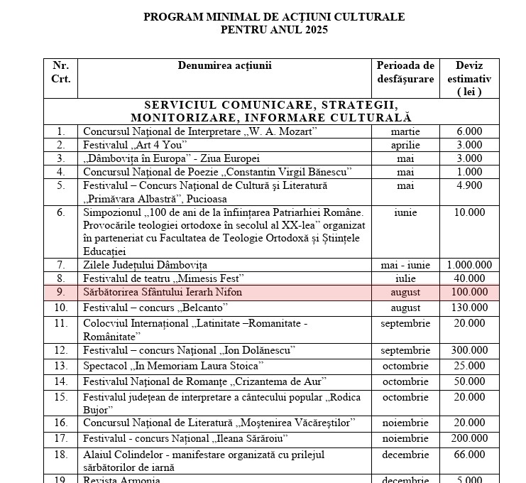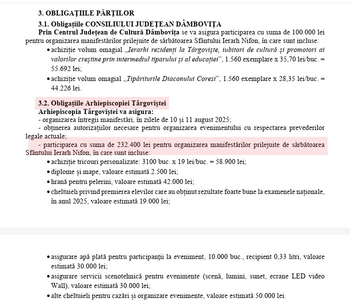 Foto: Alocări financiare pentru sărbătoare Sfăntului Ierarh Nifon, în parteneriatul dintre CJ Dâmbovița (100.000 de lei) și Arhiepiscopia Târgoviștei (230.000 de lei, costul total al sărbătorii)