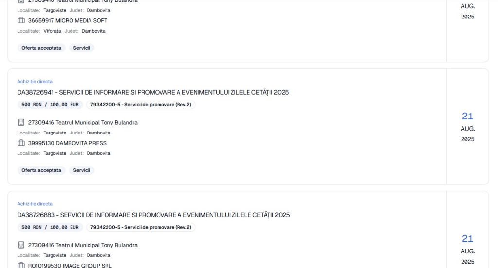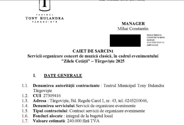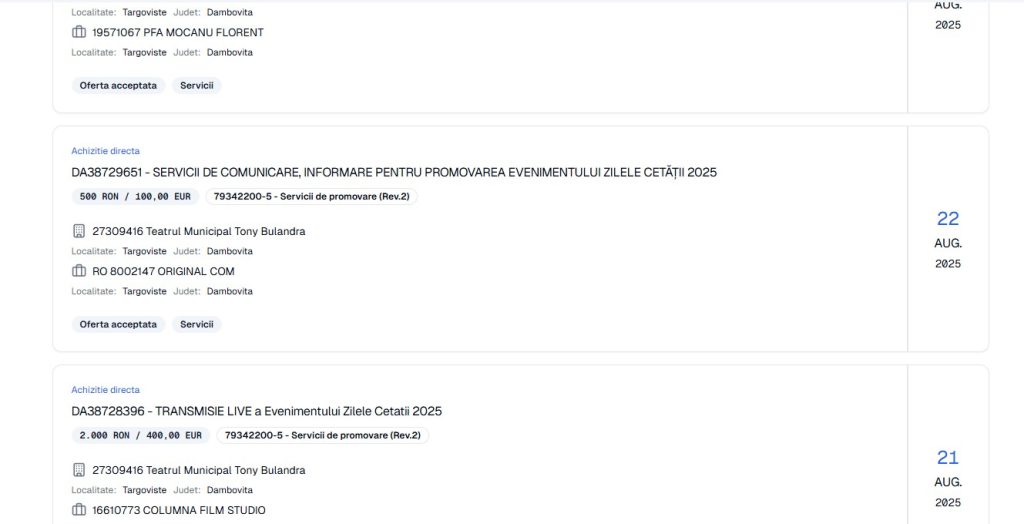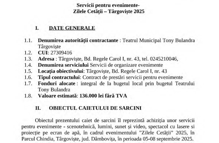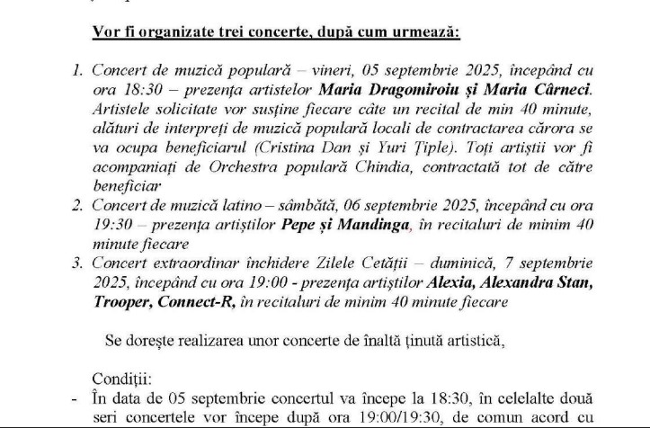 Foto: Fragment document contractare servicii organizare concerte la Zilele Cetății Târgoviște 2025
