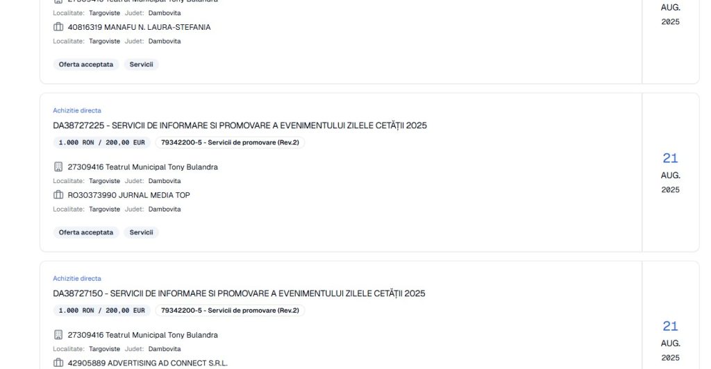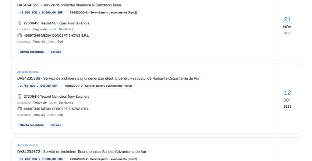 Că firma (n.m.- SC Media Concept Shows SRL) care organizează scena, pe care vor avea loc concertele de la Zilele Cetății Târgoviștei 2025, este o firmă abonată la fondurile oferite atât de generos de Primăria Târgoviște, prin intermediul teatrului “Tony Bulandra”, aproape că nici nu mai contează (vezi mai jos câteva exemple, din 2023, contracte între firma amintită și adminisitrația de la Târgoviște).