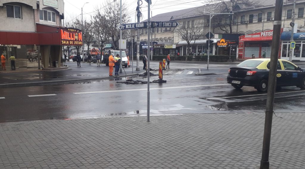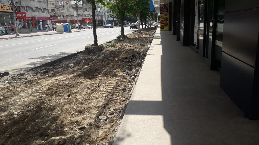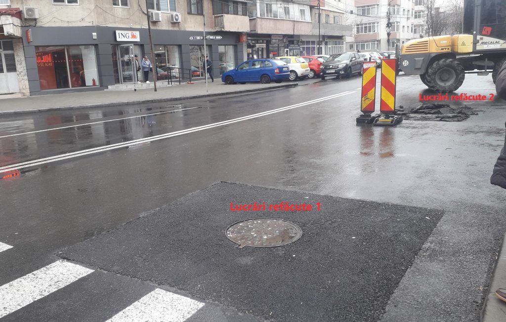 Foto: Bulevardul Independenței, Târgoviște, 19 martie 2024 (în imagine, lucrarea identificată cu termenul de “lucrări refăcute 1” are o vechime de câteva luni, ulterioară însă finalizării proiectului din programul “Anghel Saligny”, în vreme ce lucrarea identificată prin “lucrări refăcute 2” este cât se poate de proaspătă, ca și cea din fotografia anterioară, adică din data de 19 martie 2024).