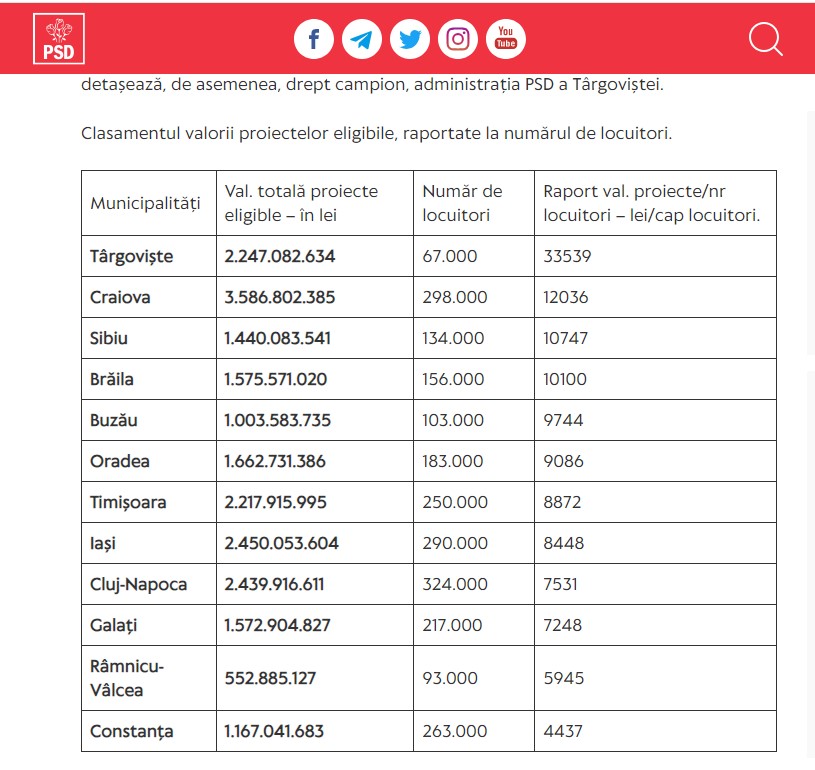 Practic, în comunicatul PSD, amintit anterior, a fost luată această sumă pentru Târgoviște (n.m.- cea de 67.000 de locuitori) doar pentru a da bine la statistici (acum realitatea convenea). În vreme ce, pentru alte municipii reședintă de județ, au fost luate în calcul populații aferente recensământului din 2011 (n.m.- populație mai mare față de recensământul din 2021, deci, la împărțirea banilor din fonduri europene, la populație, rezultatul este mai mic).