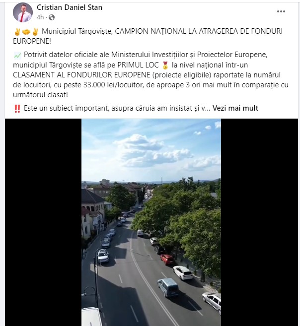 “Potrivit datelor oficiale ale Ministerului Investițiilor și Proiectelor Europene, municipiul Târgoviște se află pe PRIMUL LOC la nivel național într-un CLASAMENT AL FONDURILOR EUROPENE (proiecte eligibile) raportate la numărul de locuitori, cu peste 33.000 lei/locuitor, de aproape 3 ori mai mult în comparație cu următorul clasat!”