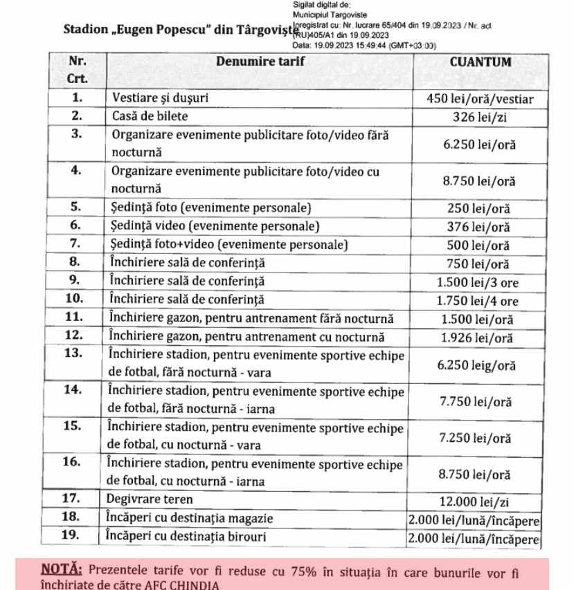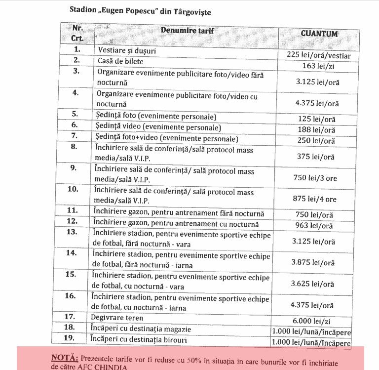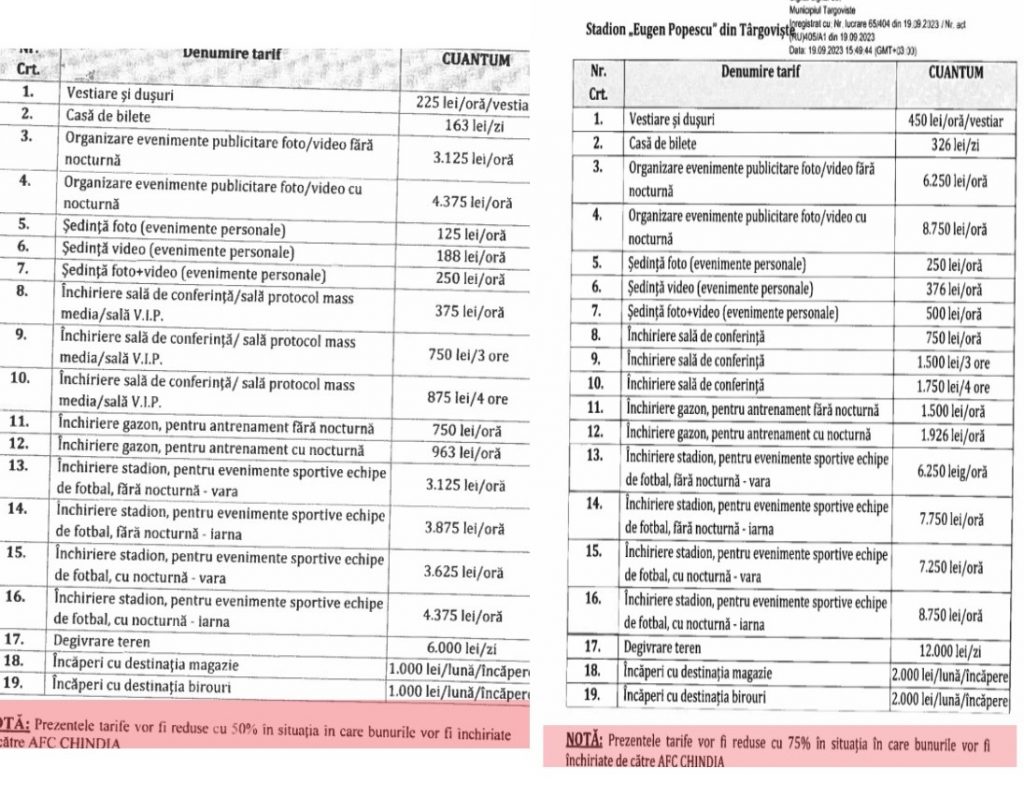 Asta și în condițiile în care cei de la Chindia, în ciuda măririlor din septembrie, vor plăti, teoretic, aceiași bani, pentru folosirea stadionului. Chindia beneficiază de o reducere de 75%, față de alți doritori. În aprilie, la tarife la jumătate față de cele din septembrie, reducerea era de doar 50%, ceea ce face ca, în sumă fixă, banii de plătit să fie exact aceiași, pentru cei de la Chindia Târgoviște, și după dublarea tarifelor din septembrie 2023.