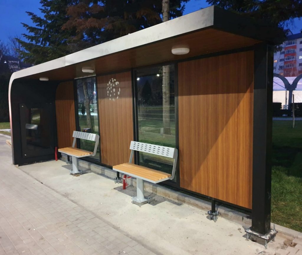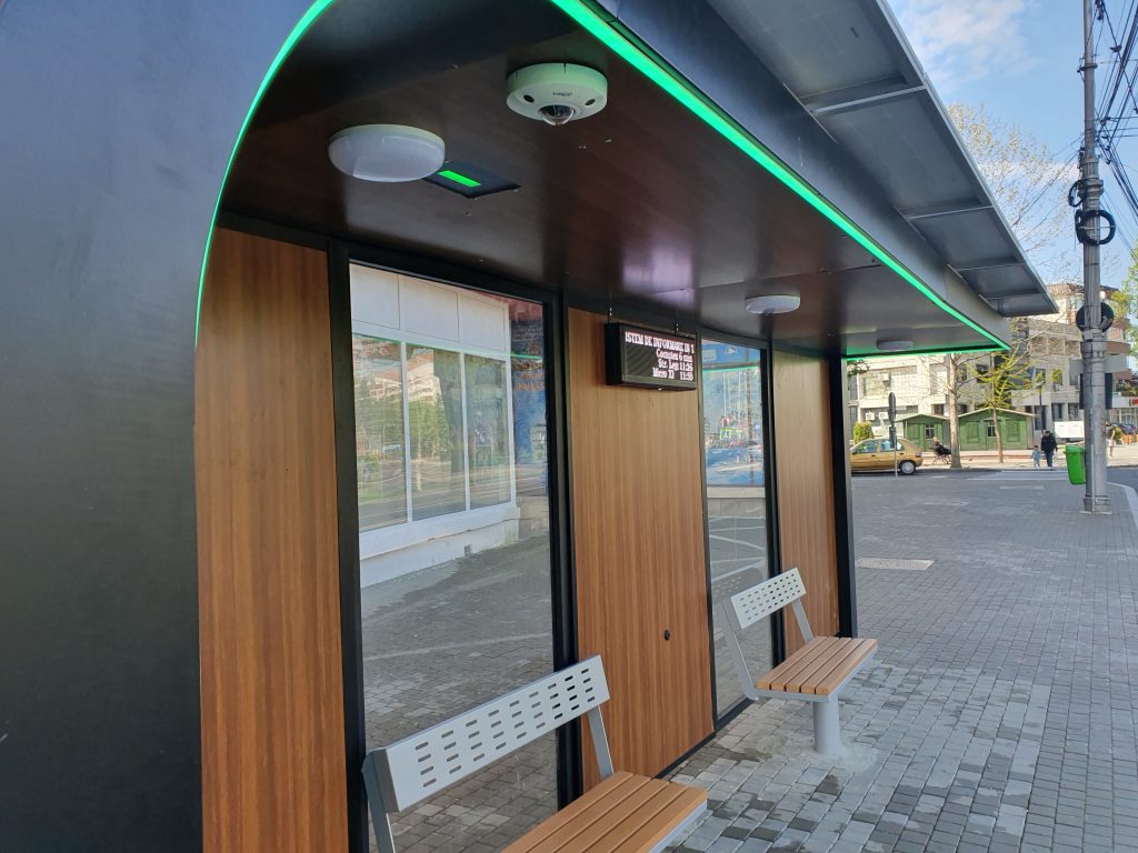 Stațiile vor avea o lungime de 6 m, vor dispune de touch screen monitor (dimensiune display 125 cm, ecran tactil, grosime sticlă 8 mm, sticla fiind călită, rezistentă la explozie, anti-ultraviolete, reflexie scăzută, transmisie a luminii peste 97%), vor fi dotate cu panou de informații digital (dimensiune modul: 256×128 mm, luminozitate: maxim 6000 cd/m2, reglabilă cu senzor crepuscular încorporat, ce afișează indicativul traseului de transport public, direcția și timpul de așteptare), sistem fotovoltaic cu o putere instalată de minim 2 kW (are in componență 6 panouri fotovoltaice), router wi-fi, camere de luat vederi, prize USB. În plus, stațiile vor fi dotate cu senzori de temperatură, de umiditate și de poluare, la care adăugăm banda LED de contur care indică nivelul de poluare (Roșu – poluare ridicată, Galben – grad mediu de poluare, Verde – poluare scăzută). Toată structura metalică este protejată anticoroziv și vopsită în câmp electrostatic cu pulberi. Principala sursa de alimentare cu energie electrică este reprezentată de kit-ul fotovoltaic, integrat în structura stației de autobuz”